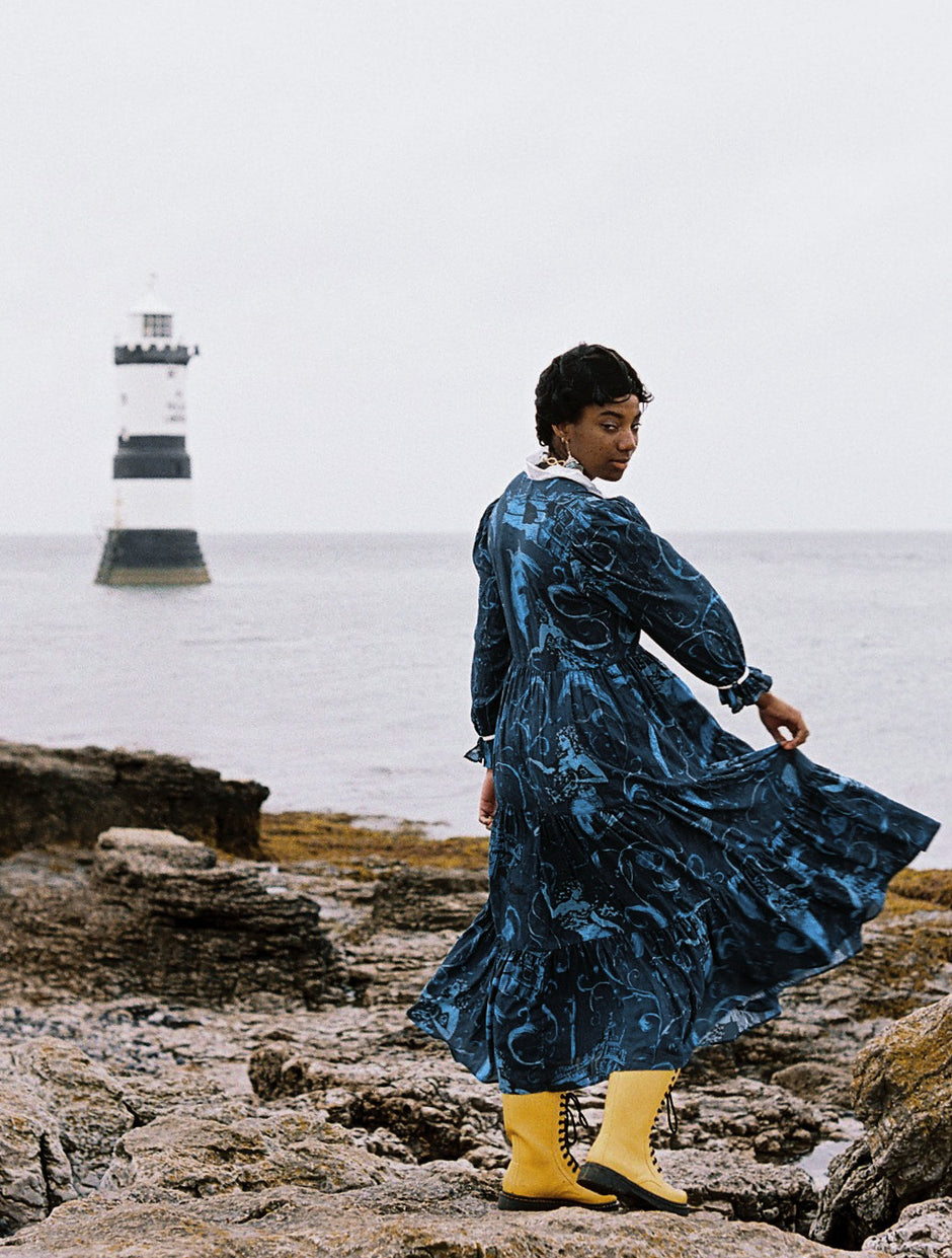 THIS AUTUMN WINTER COLLECTION AIMS TO ENCAPSULATE THE WILD, UNPREDICTABLE, UNWAVERING FORCE OF THE SEA AND ALL OF ITS MYSTERIES. TALES OF SIRENS AND SEA BEASTS INFILTRATE THE SOFT FEMININE SILHOUETTES THROUGH HAND PAINTED PRINTS AND EMBROIDERIES. SHAPES ARE FORMED FROM SEA CAPTAIN’S UNIFORMS AND CONTRASTED WITH WILLOWY ETHEREAL SHAPES THAT DRIFT EERILY THROUGH THE OCEANS WAVES. PRINTS FEATURE PRECIOUS KEEPSAKES AND LUCKY CHARMS FOR SAFETY ON LONG VOYAGES, ALONGSIDE OMENS AND SIRENS LURING SAILORS TO THEIR FATE. “THUS ON LIFE’S LONELY SEA. HEARETH THE MARINERE, VOICES SAD, FROM FAR AND NEAR, EVER SINGING, FULL OF FEAR, EVER SINGING, DREARFULLY.” J.R.LOWELL