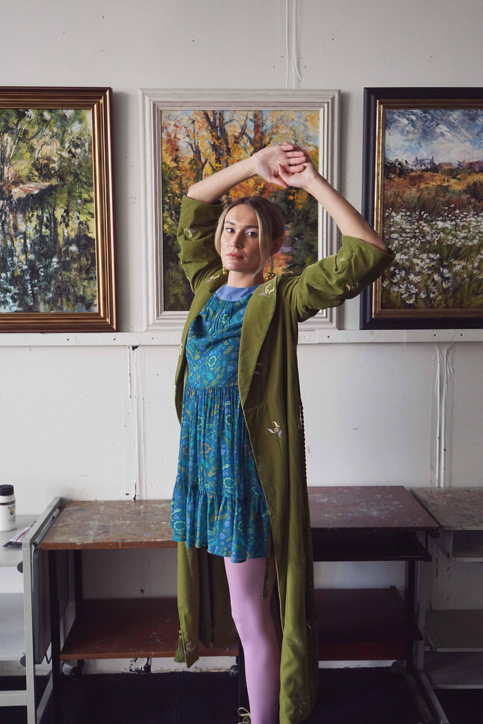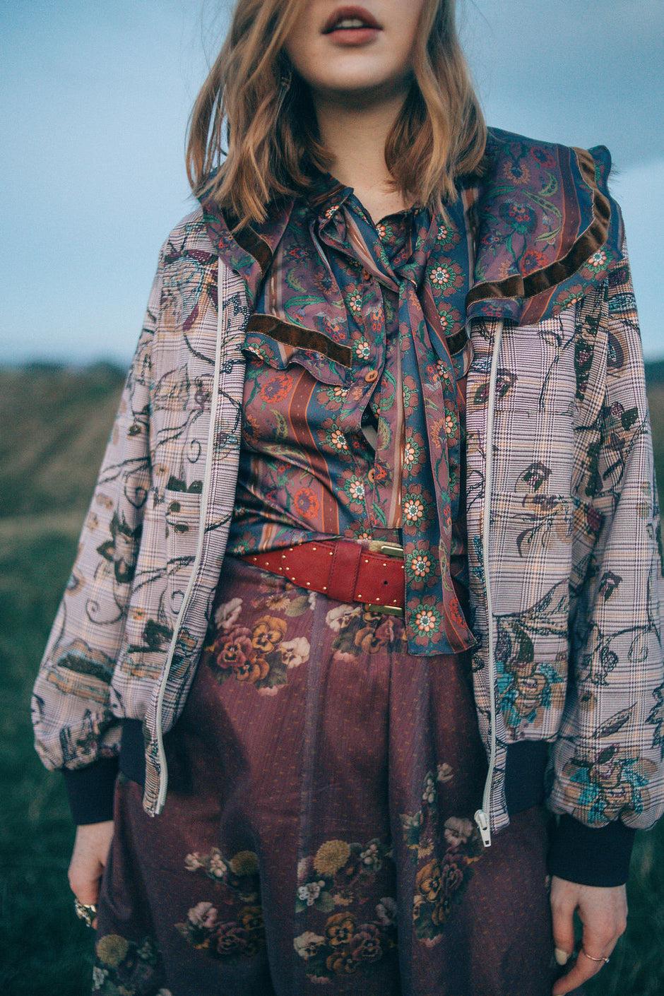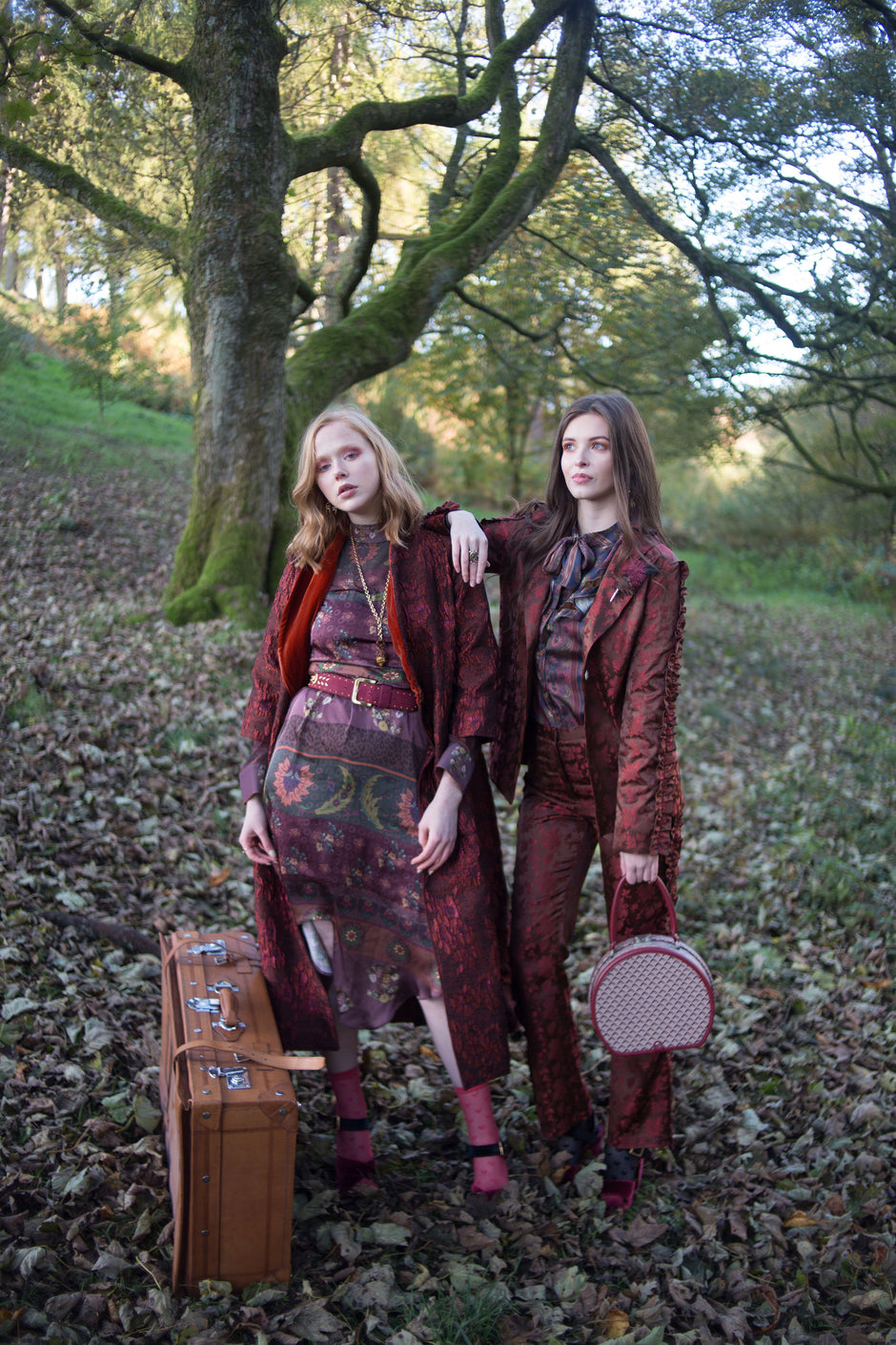 THE AUTUMN WINTER ‘18 COLLECTION LOOKS AT NOMADISM WITH AN EMPHASIS ON LAYERING UP GARMENTS FOR WARM. THE COLOURS ARE TAKEN FROM AUTUMNAL FORESTS FOR CAMOUFLAGE. THESE ARE COMPLIMENTED BY UNIQUE PRINTS WHICH ARE INSPIRED BY GATHERING DIFFERENT TEXTILES TOGETHER TO MAKE GARMENTS FROM OLD BITS OF PRINTED FABRICS THAT MIGHT HAVE BEEN FOUND ON A JOURNEY TO CREATE AN ECLECTIC COLLAGE OF FLORAL, STITCHED, BLOCK PRINTED IMAGERY.