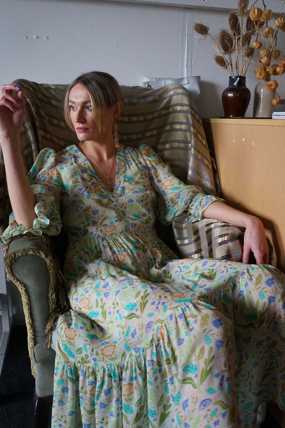 THE BLOOMSBURY COLLECTION TAKES INSPIRATION FROM THE BODY OF MODERNIST ENGLISH WRITERS, PHILOSOPHERS AND ARTISTS WHO BECAME NOTORIOUS FOR THEIR COLOURFUL GATHERINGS AT CHARLESTON HOUSE. NESTLED IN THE SUSSEX COUNTRYSIDE, CHARLESTON HOUSE ALLOWED THE VISIONARIES TO ESCAPE THE INCREASINGLY FAST-PACED, MODERN ENVIRONMENT OF THE CITY THAT WAS EXPANDING AROUND THEM. THIS COLLECTION SEEKS TO CAPTURE SOME OF THIS REBELLIOUSLY ESCAPIST SENSIBILITY, BUSTLING WITH ULTRA FEMININE EFFLORESCENT PRINTS THAT ECHO THE BEAUTIFUL GARDENS AT CHARLESTON AND DUNCAN GRANT AND VANESSA BELL’S ARTWORK AROUND THE HOUSE. THE COLOUR SCHEME IS ALSO REMINISCENT OF NATURE WITH AN EMPHASIS ON GREEN AND PASTEL FLORAL SHADES THAT REFLECT THE GROUP’S INVESTMENT IN THE ENGLISH COUNTRYSIDE. FLOATY, WHIMSICAL SHAPES FROM THE ERA ARE EVIDENT BUT ARE CONTRASTED WITH A MASCULINE VELVET SMOKING JACKET, THE COMBINATION OF WHICH ENCAPSULATES THE BOHEMIAN AND FORWARD-THINKING LIFESTYLE OF THE MEMBERS.
