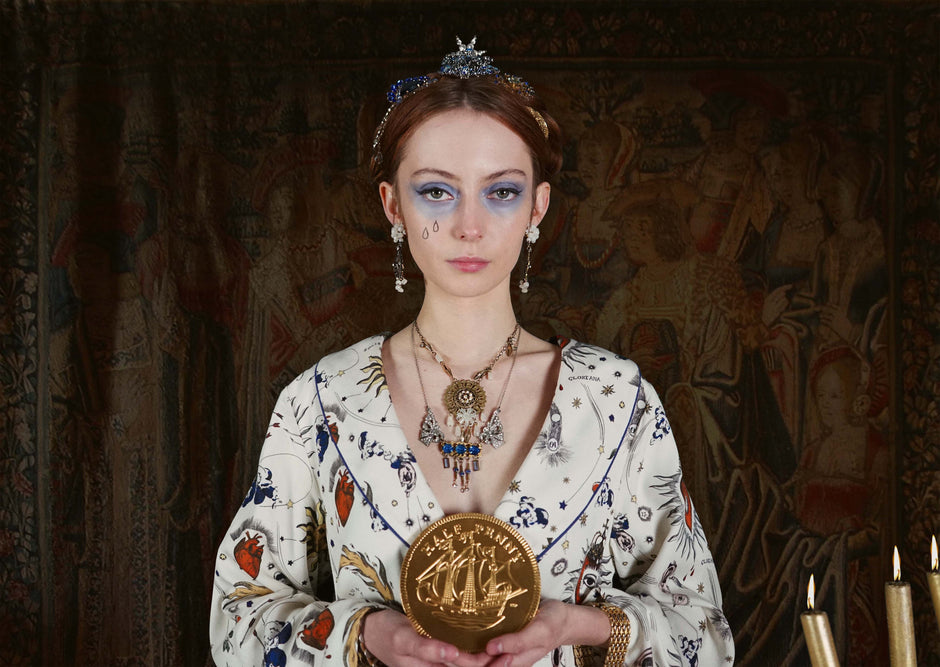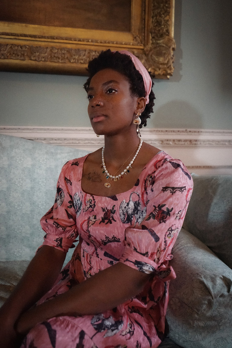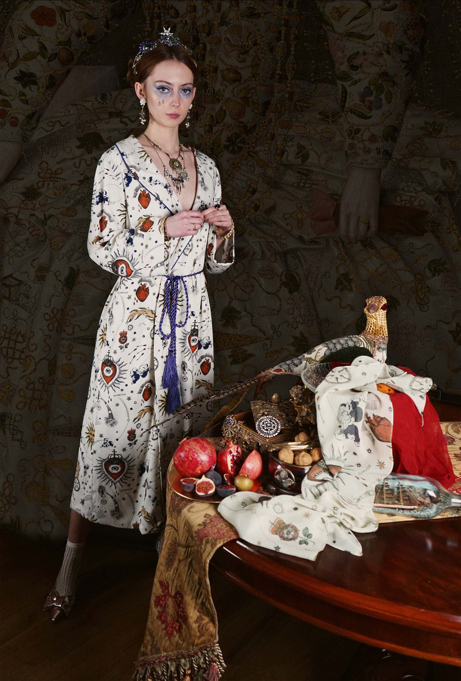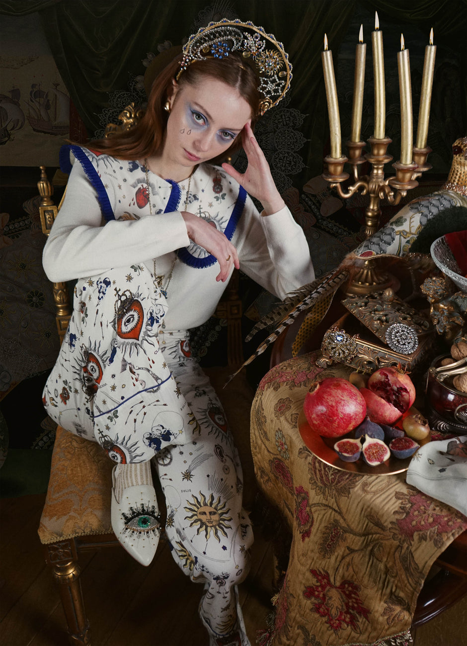 THIS CHRISTMAS COLLECTION IS INSPIRED BY MY FAVOURITE MONARCH ELIZABETH I, AND THE CELEBRATED “GOLDEN AGE” – A TIME WHEN ART AND LITERATURE FLOURISHED, AND NATIONAL PRIDE ROSE WITH THE GROWTH OF MARITIME STRENGTH. IT WAS ALSO A PERIOD OF OPULENCE AND EXTRAVAGANCE, EMBODIED BY THE QUEEN HERSELF, WHO WORE LAVISH OUTFITS AND JEWELLERY TO SHOWCASE HER WEALTH AND POWER. I LOVE THAT SHE IS AN INFLUENCE ON FASHION FOR US TODAY, AS SHE WAS FOR SOCIETY BACK IN THE 1500S. I NAMED THIS COLLECTION “GLORIANA” AS A NOD TO EDMUND SPENSER’S “THE FAERIE QUEENE”, AN EPIC POEM PUBLISHED IN HONOUR OF ELIZABETH IN 1590. THE PRINT IS FULL OF SYMBOLS THAT CAN BE SEEN IN PAINTINGS OF ELIZABETH’S OWN REGAL WARDROBE. THE EYES AND EARS SUGGEST HER ALL-SEEING, ALL-HEARING AUTHORITY, WHILE THE HEARTS REPRESENT HER LOVE OF GOD AND COUNTRY. YOU MAY ALSO BE ABLE TO SPOT THE TUDOR ROSE, WHICH ARTISTS OF THE TIME USED TO SYMBOLIZE THE RELATIVE UNITY THE TUDOR ERA BROUGHT TO THE LAND.