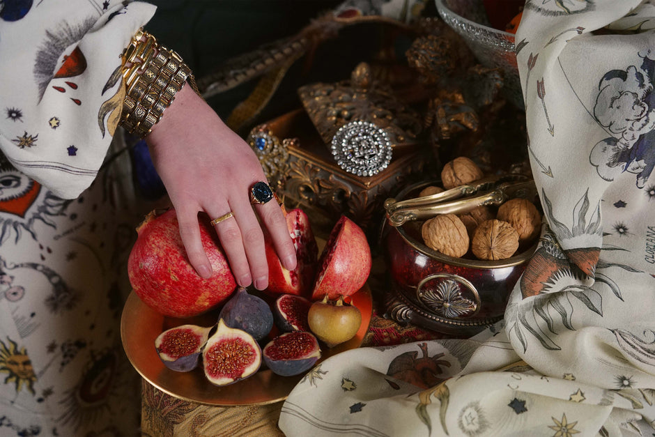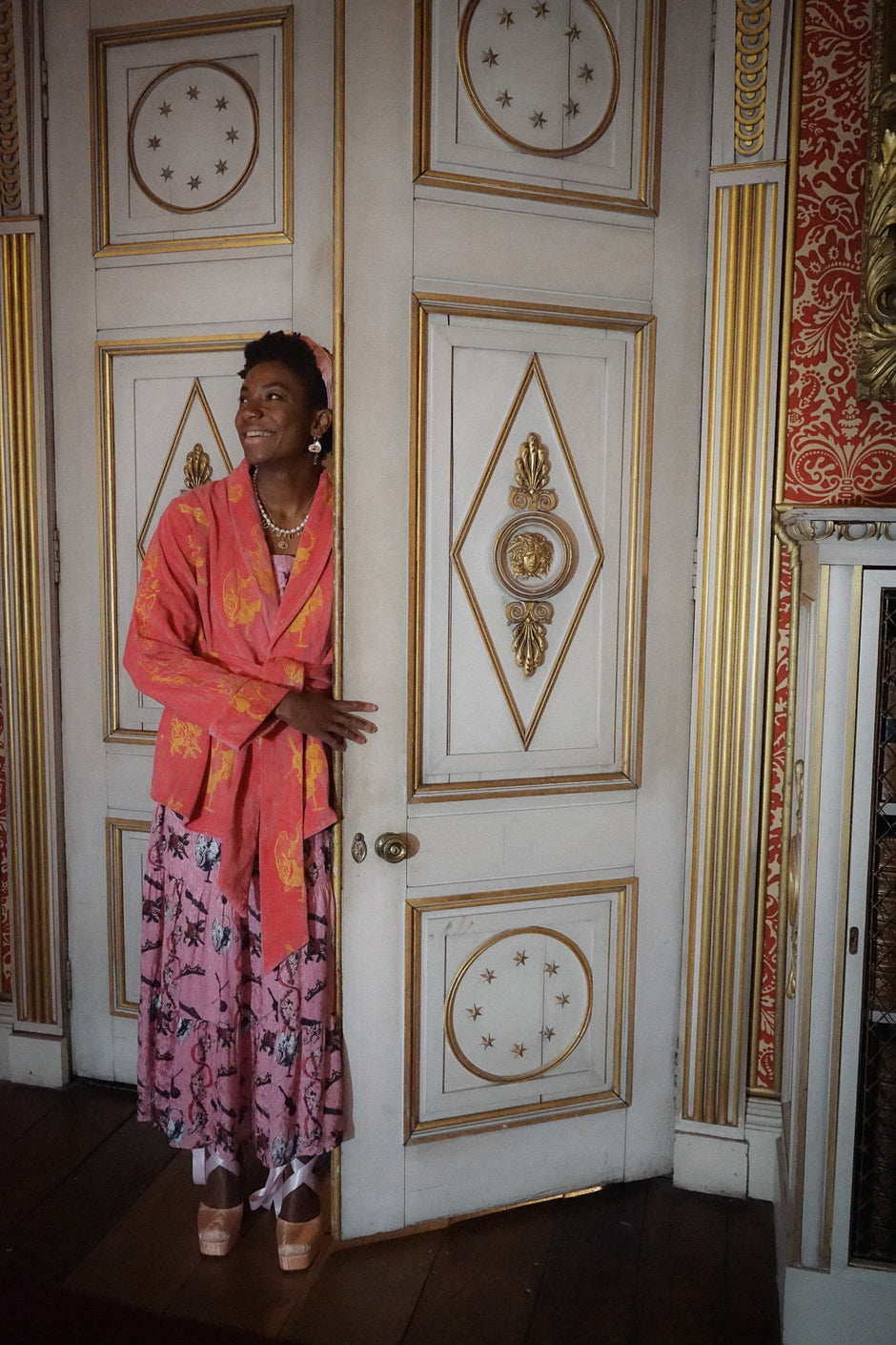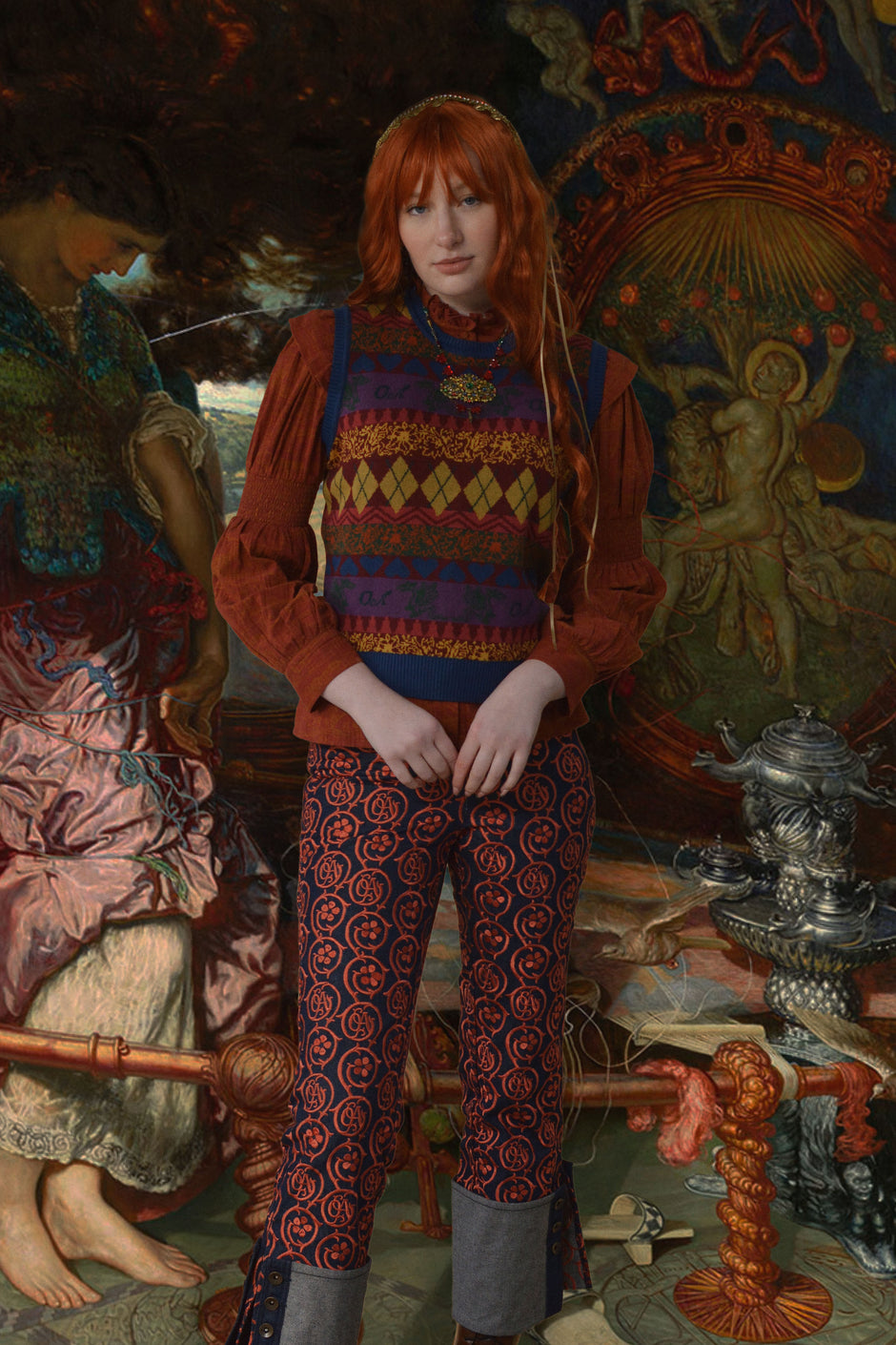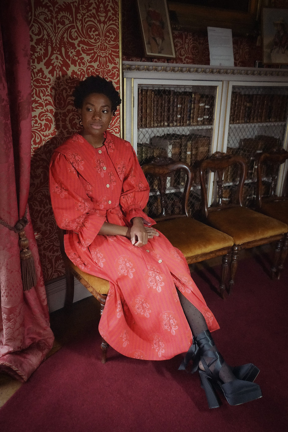 THIS CHRISTMAS COLLECTION IS INSPIRED BY MY FAVOURITE MONARCH ELIZABETH I, AND THE CELEBRATED “GOLDEN AGE” – A TIME WHEN ART AND LITERATURE FLOURISHED, AND NATIONAL PRIDE ROSE WITH THE GROWTH OF MARITIME STRENGTH. IT WAS ALSO A PERIOD OF OPULENCE AND EXTRAVAGANCE, EMBODIED BY THE QUEEN HERSELF, WHO WORE LAVISH OUTFITS AND JEWELLERY TO SHOWCASE HER WEALTH AND POWER. I LOVE THAT SHE IS AN INFLUENCE ON FASHION FOR US TODAY, AS SHE WAS FOR SOCIETY BACK IN THE 1500S. I NAMED THIS COLLECTION “GLORIANA” AS A NOD TO EDMUND SPENSER’S “THE FAERIE QUEENE”, AN EPIC POEM PUBLISHED IN HONOUR OF ELIZABETH IN 1590. THE PRINT IS FULL OF SYMBOLS THAT CAN BE SEEN IN PAINTINGS OF ELIZABETH’S OWN REGAL WARDROBE. THE EYES AND EARS SUGGEST HER ALL-SEEING, ALL-HEARING AUTHORITY, WHILE THE HEARTS REPRESENT HER LOVE OF GOD AND COUNTRY. YOU MAY ALSO BE ABLE TO SPOT THE TUDOR ROSE, WHICH ARTISTS OF THE TIME USED TO SYMBOLIZE THE RELATIVE UNITY THE TUDOR ERA BROUGHT TO THE LAND.