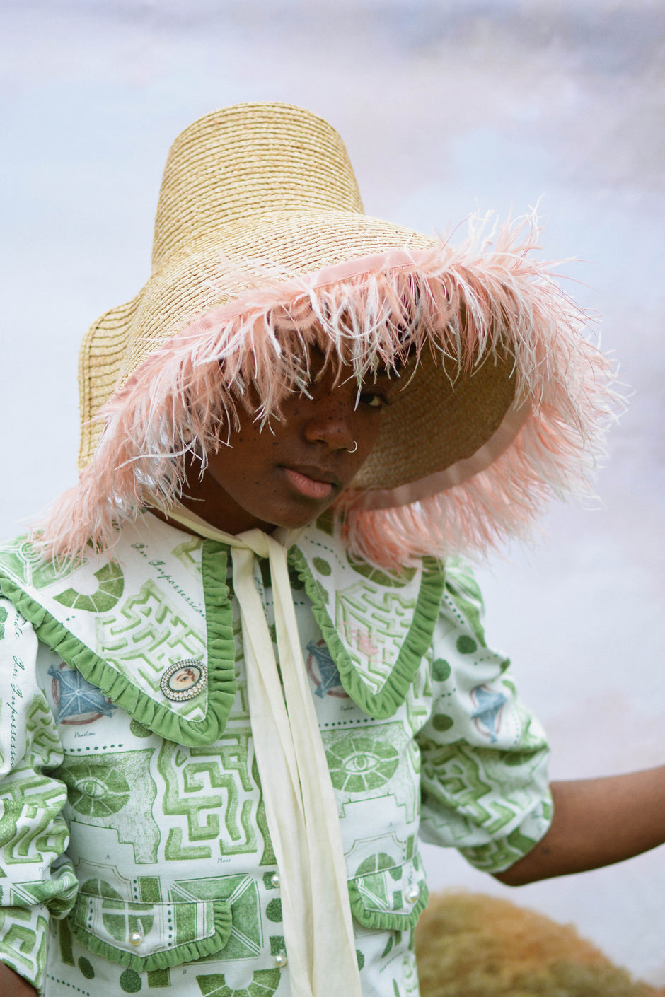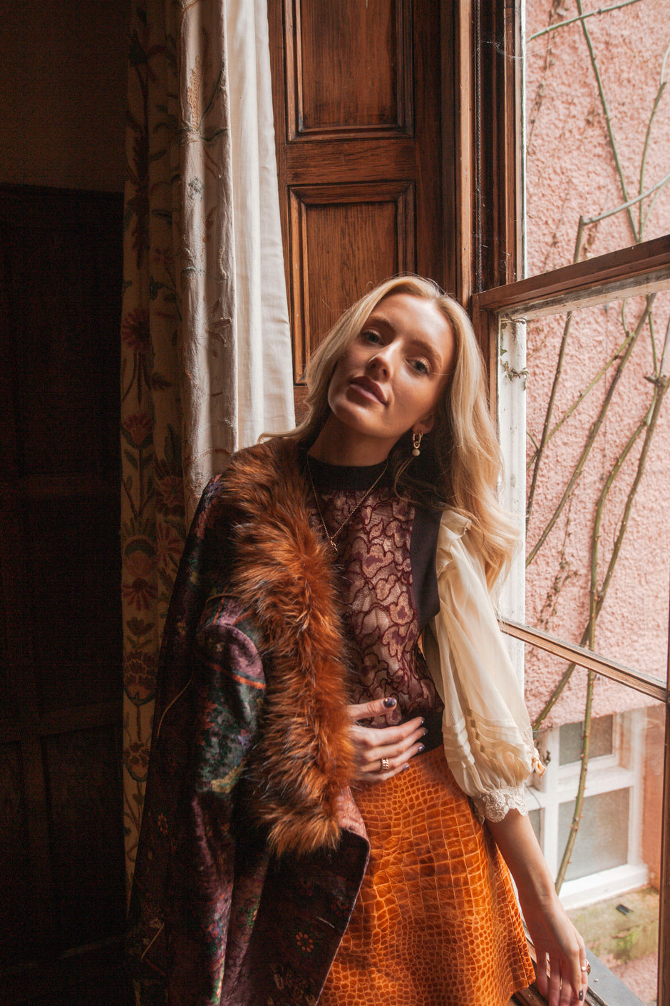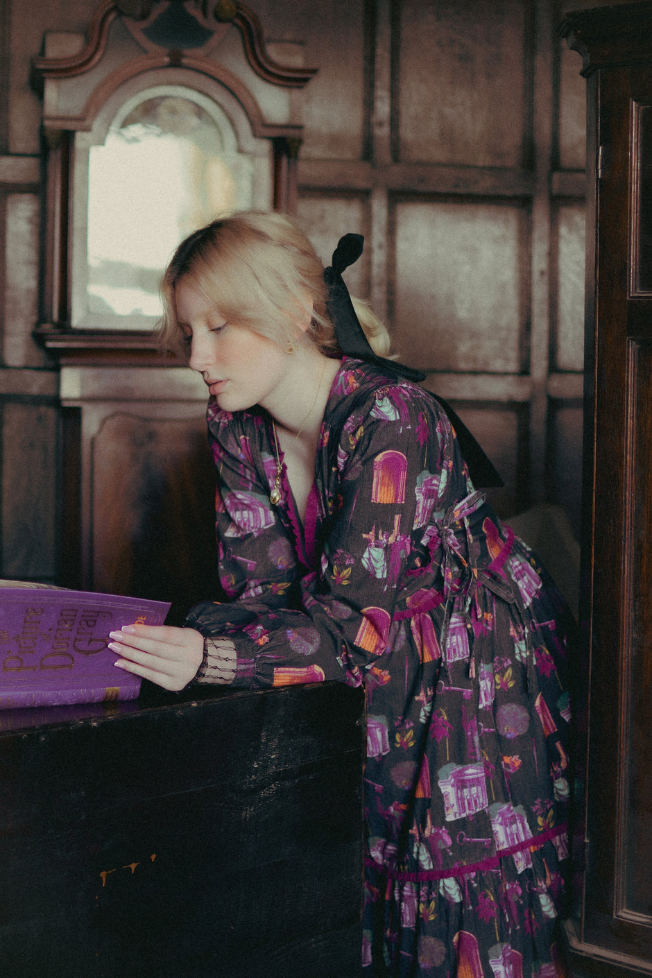 THE AUTUMN WINTER ‘19 COLLECTION TAKES INSPIRATION FROM JOHN KEATS’ POEM OF THE SAME NAME. LOOKING INTO LOCAL FOLKLORE AND SUPERSTITION; PRINTS ARE MADE FROM HAND-DRAWN ILLUSTRATIONS OF GATHERINGS, DEEP WITHIN THE TANGLED WILLOWS, OF SUPERNATURAL BEINGS COMBINED WITH CELESTIAL SYMBOLISM TO CREATE OUR OWN TOILE DE JOUY. BELL SLEEVES AND LACE TRIMMED COLLARS TAKEN FROM PILGRIM CLOTHES ARE RE-IMAGINED FOR THE CONTEMPORARY ‘WITCH’ IN MINI DRESSES WITH SILVER EYELET TRIMS AND CROPPED VELVET JACKETS.