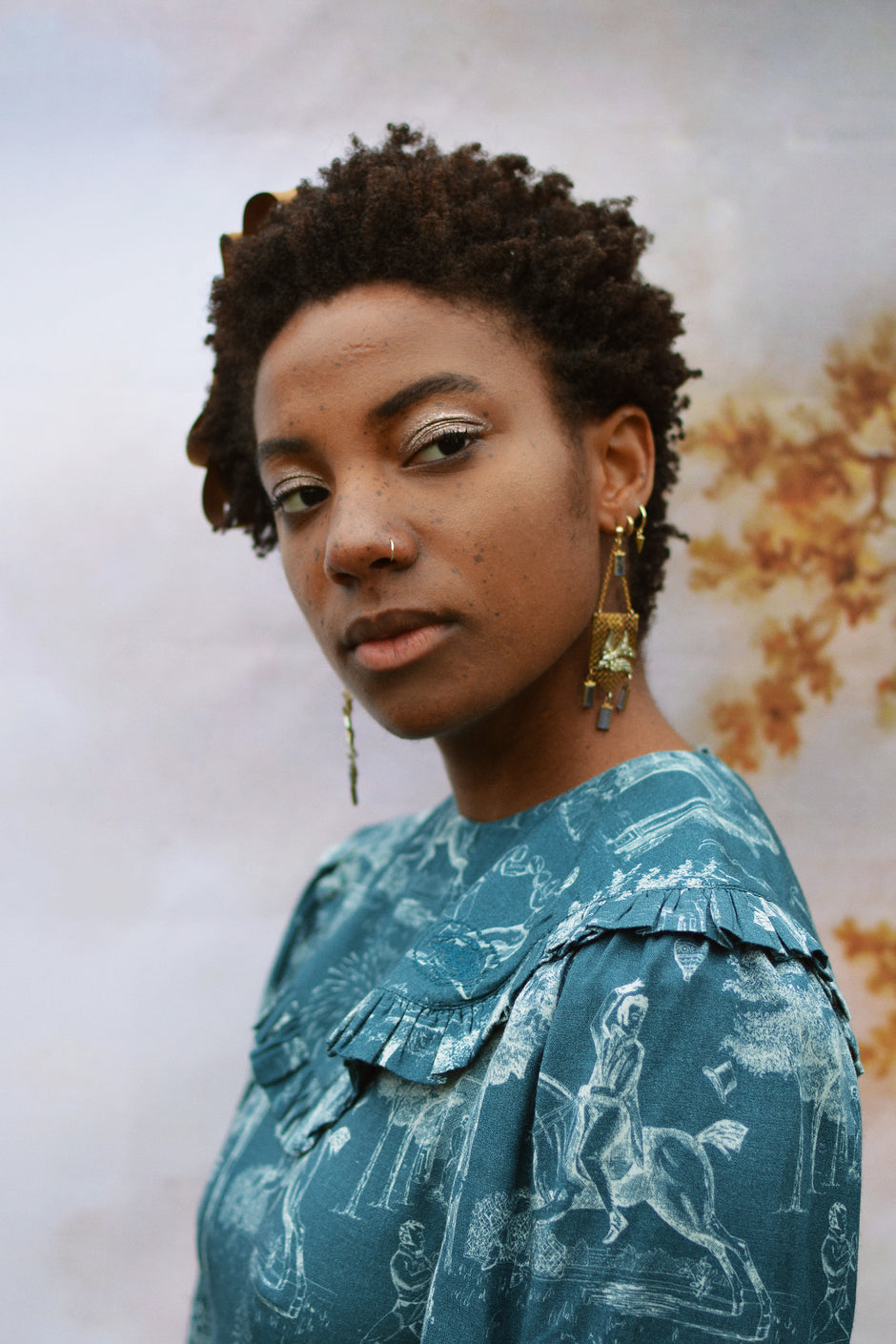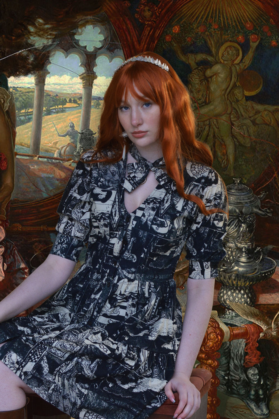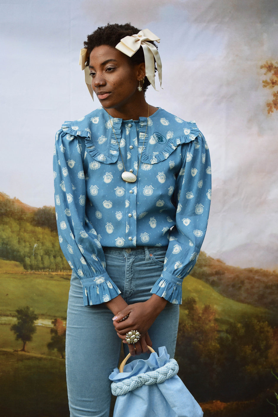 THE AUTUMN WINTER ‘19 COLLECTION TAKES INSPIRATION FROM JOHN KEATS’ POEM OF THE SAME NAME. LOOKING INTO LOCAL FOLKLORE AND SUPERSTITION; PRINTS ARE MADE FROM HAND-DRAWN ILLUSTRATIONS OF GATHERINGS, DEEP WITHIN THE TANGLED WILLOWS, OF SUPERNATURAL BEINGS COMBINED WITH CELESTIAL SYMBOLISM TO CREATE OUR OWN TOILE DE JOUY. BELL SLEEVES AND LACE TRIMMED COLLARS TAKEN FROM PILGRIM CLOTHES ARE RE-IMAGINED FOR THE CONTEMPORARY ‘WITCH’ IN MINI DRESSES WITH SILVER EYELET TRIMS AND CROPPED VELVET JACKETS.