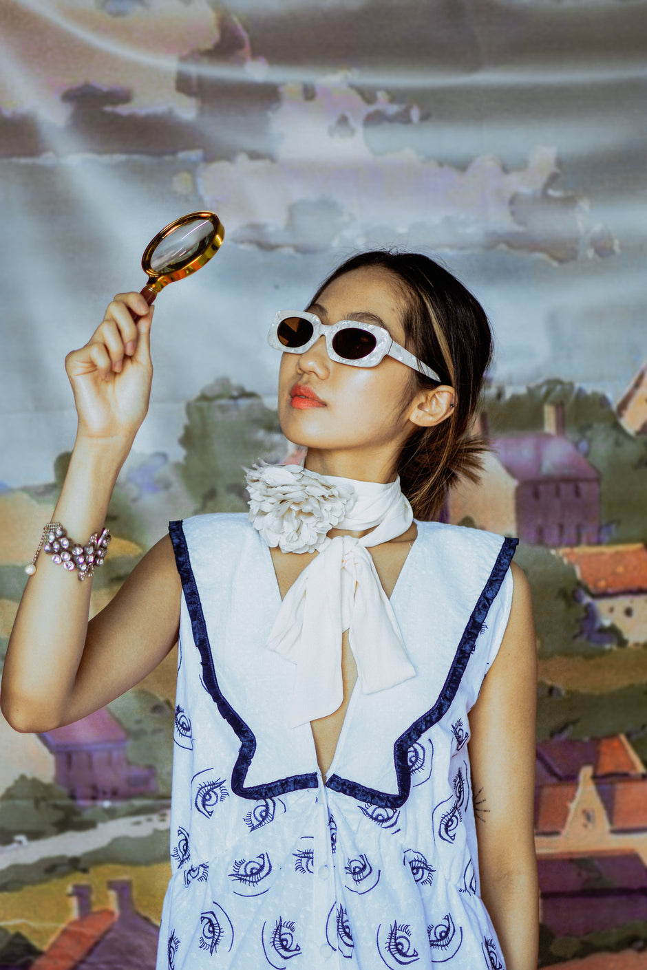 THE LADY VANISHES SPRING SUMMER COLLECTION TAKES INSPIRATION FROM 1930S MYSTERY NOVELS, WITH REFERENCES FROM THE 'QUEEN OF CRIME' HERSELF AGATHA CHRISTIE ALONGSIDE MOODY AND RESONANT DAPHNE DU MAURIER THEMES. VIBRANT AND FRESH COLOURS ARE TAKEN FROM THE 'ENGLISH RIVIERA' TO ENHANCE THE CHRISTIE SYMBOLISM IN THE PIECES SUCH AS IMAGERY ASSOCIATED WITH POIROT'S DISTINCTIVE STYLE LIKE THE POCKET WATCH, SMALL ROUND GLASSES AND ACCUSING FINGER, ALONGSIDE THE CRIMES THAT HE SOLVES SITS THE POISON BOTTLE AND THE GUN WITH THE SPIKED WINE. ALWAYS WATCHING OVER ANY SUSPICIOUS BEHAVIOUR IS THE ART DECO EYE, A CONTINUING THEME THROUGHOUT THE PRINTS. THE DARKER ELEMENTS OF THE PRINTS ARE CONTRASTED BY THE SOFT ELEGANT SHAPES. USING LATE 1920S AND EARLY 1930S VINTAGE CLOTHING AS A BASE FOR THIS SEASON’S SILHOUETTE THE PIECES RANGE FROM THE CLASSIC BIAS DAY DRESS WORN EXPLORING QUIET ENGLISH VILLAGES, A SAFARI SUIT PERFECT FOR AN INVESTIGATION AT A LOCAL COUNTRY HOUSE, TO SHORT SETS AND NAUTICAL PIECES, IDEAL FOR SUNBATHING ON BURGH ISLAND…AT YOUR PERIL.