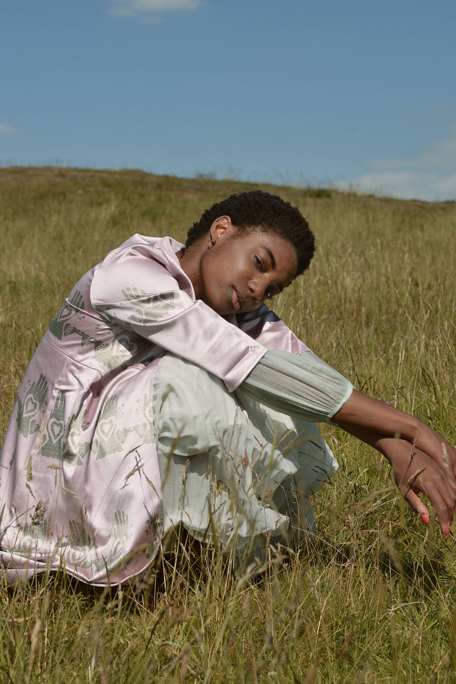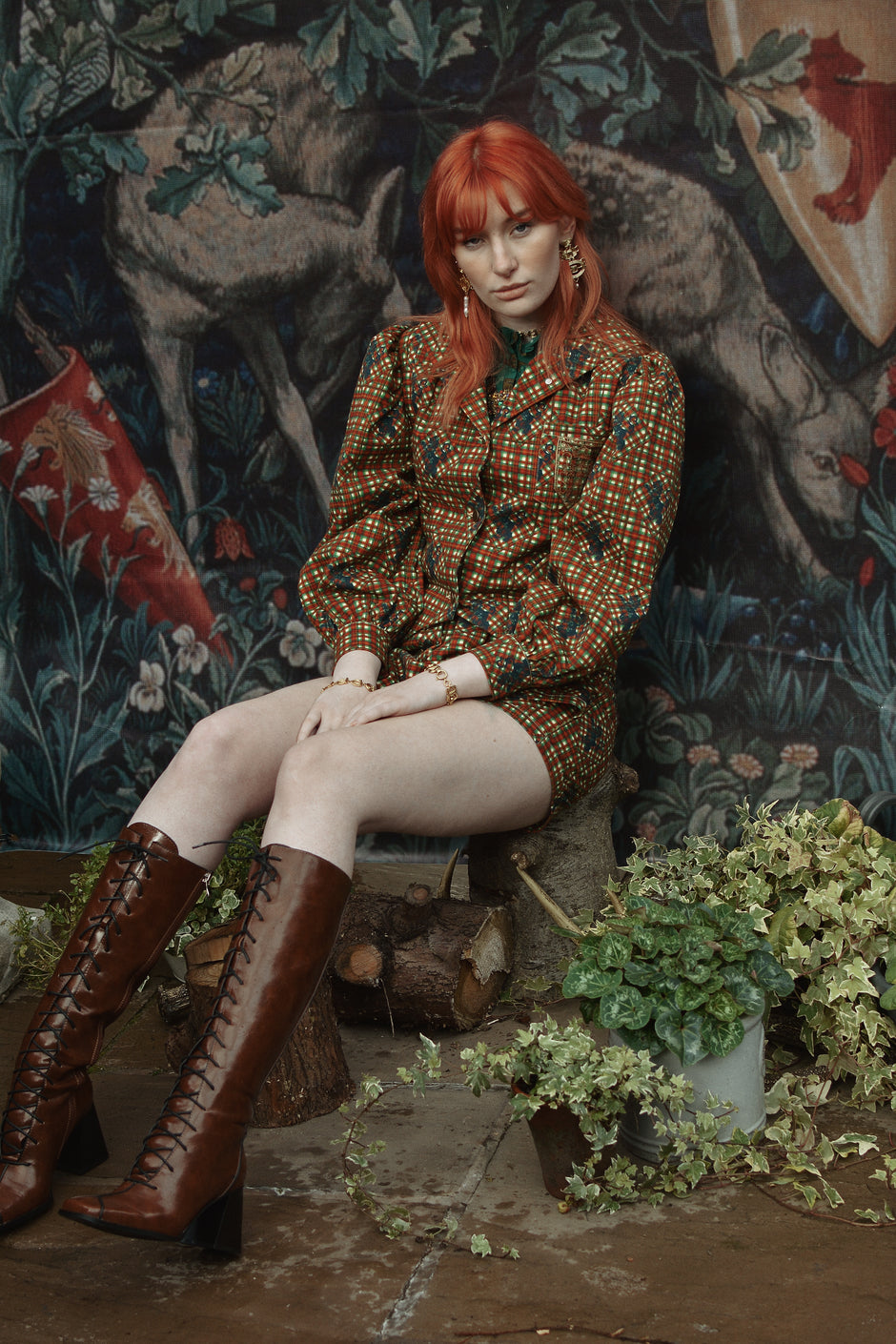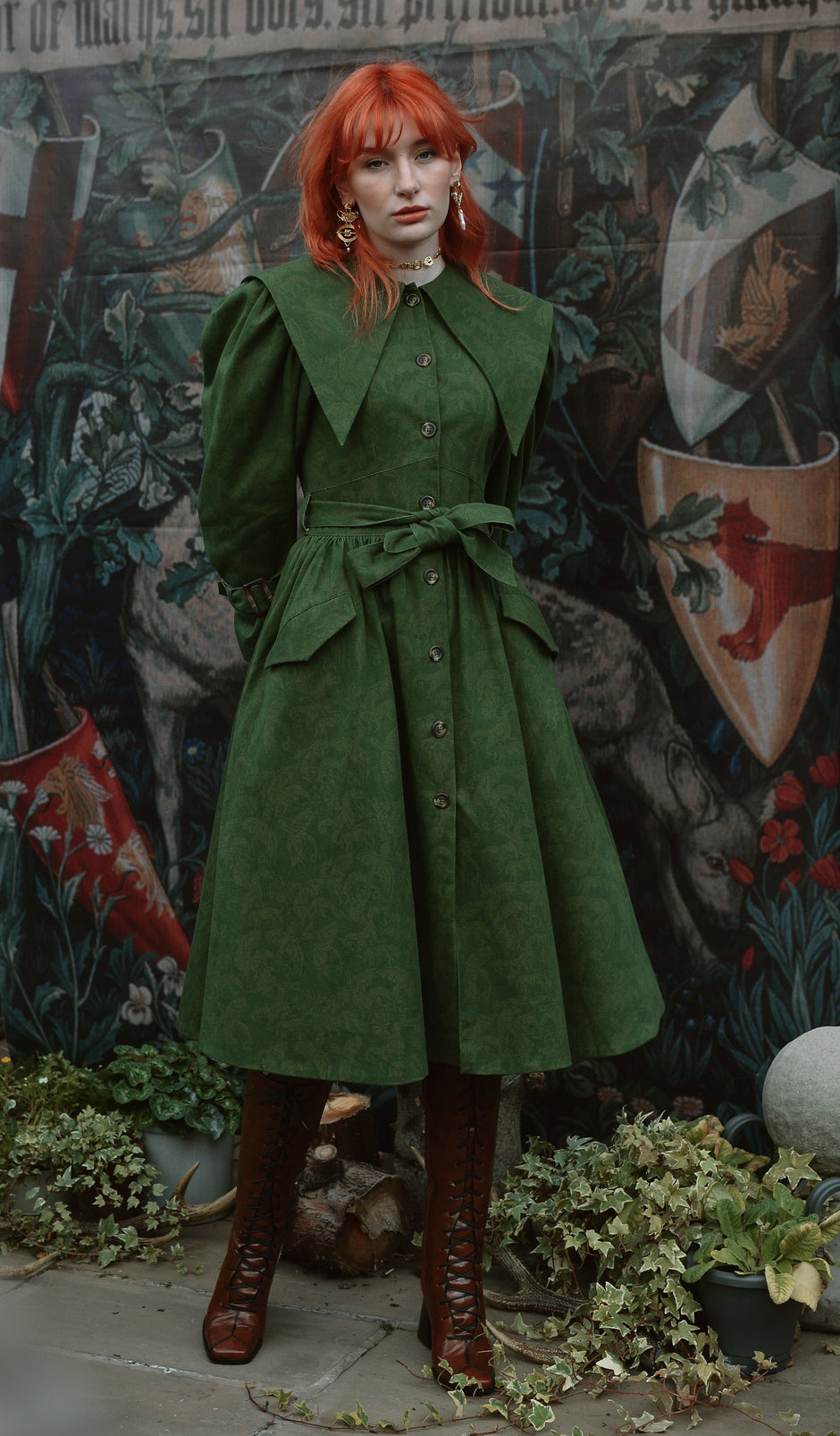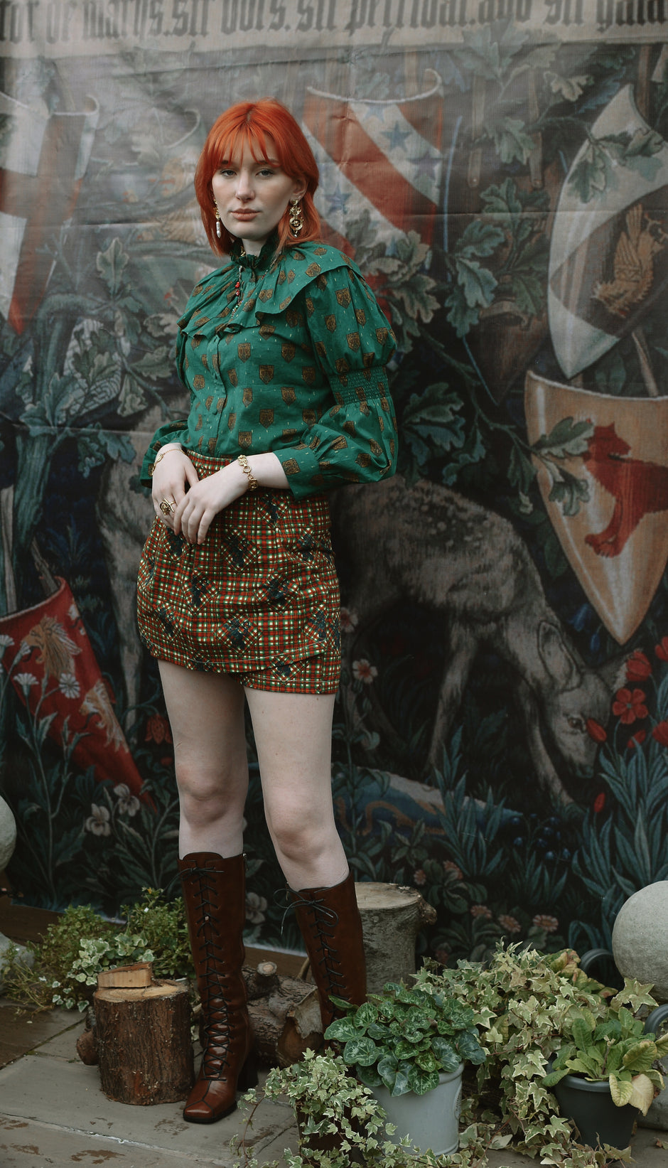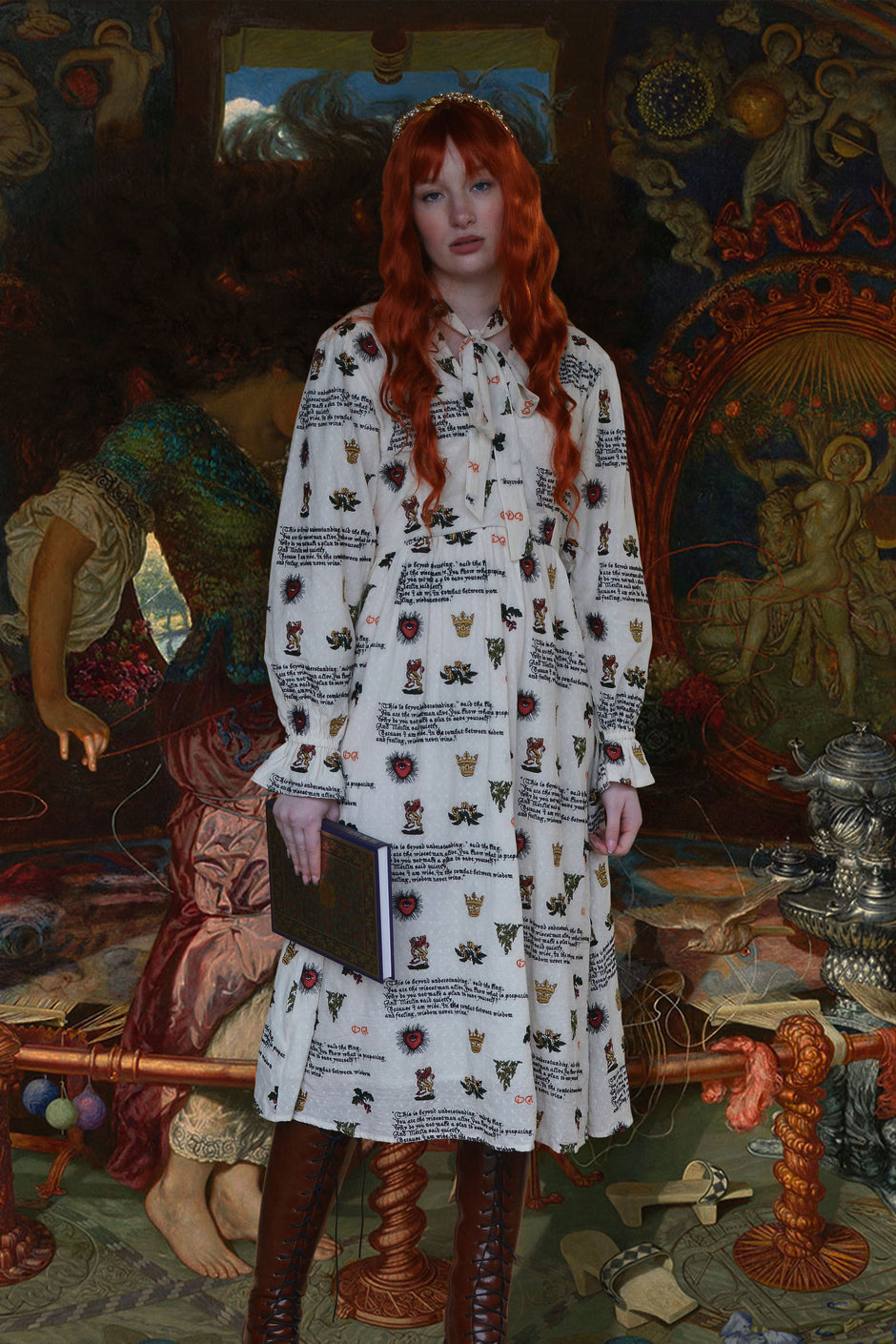 ENTER THE WORLD OF LEGENDS, DRAGONS, MYTHOLOGICAL CREATURES AND MAGIC. INSPIRED BY THE LOCAL FOLKLORE OF ALDERLEY EDGE FOREST AND IT’S RESIDENT WIZARD, MY JEWEL TONED PRINTS THIS SEASON TAKE ON THE FORM OF ANCIENT STORIES, RETRIEVING SWORDS FROM MYSTERIOUS LAKES, WELSH TALES OF DRAGONS WITH ACTS OF CHIVALRY AND BRAVERY. PAIRED WITH CLASSIC TARTANS, REGAL ELEMENTS AND WILLIAM MORRIS INSPIRED SYMBOLISM TO EVOKE THIS MYSTICAL ERA BUT IN AN UPDATED AND WEARABLE STYLE. TO ENCAPSULATE THE ROMANCE OF THIS THEME I LOOKED TO THE PRE-RAPHAELITES, WHO REINVIGORATED INTERESTS IN CLASSIC BRITISH FOLKLORE IN BEAUTIFUL PAINTED FORM, WITH FLOWING FABRICS AND UNCONVENTIONALLY LOOSE WAISTLINES. I HAVE IMBUED A SENSE OF MEDIEVAL DRESS IN MY SHAPE DESIGN BY TAKING BODICE SHAPES AND PANELLING DETAILS FROM ARMOUR AND DOUBLETS, WITH GATHERED PUFF SLEEVES TO CREATE THIS ICONIC WHIMSICAL SILHOUETTE.