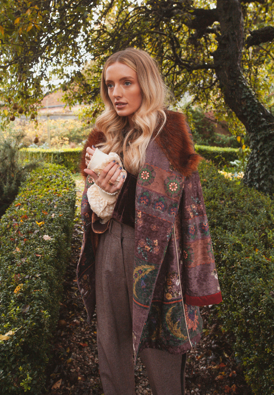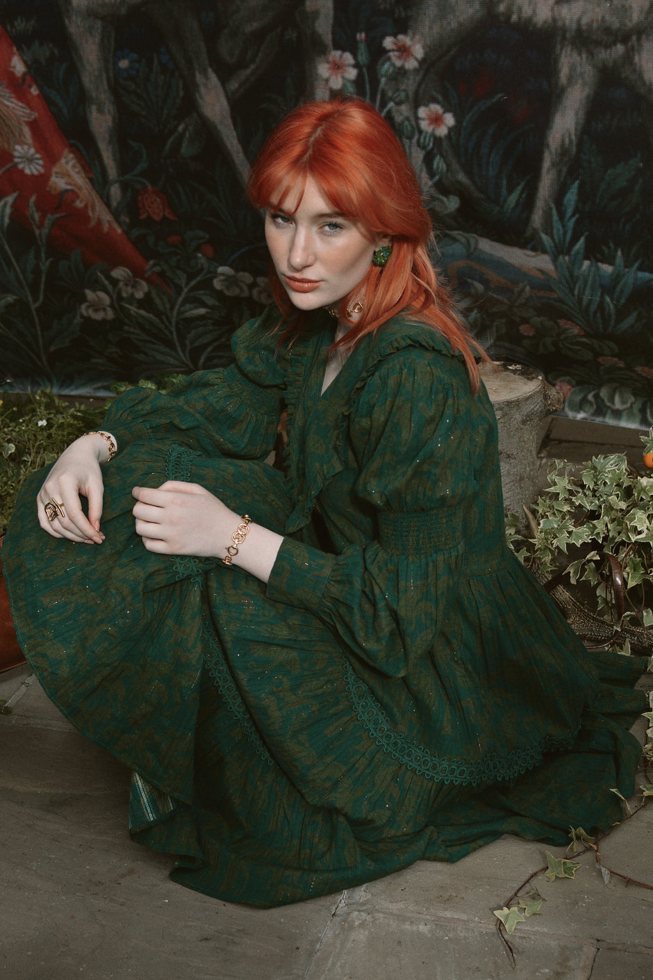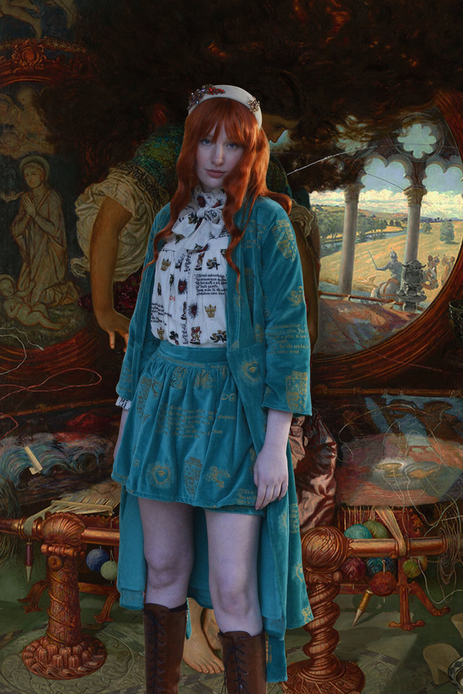 INSPIRED BY THE 1833 LYRICAL BALLAD BY ENGLISH POET ALFRED TENNYSON, WHICH TELLS THE TRAGIC STORY OF ELAINE OF ASTOLAT TRAPPED IN A TOWER ABOVE CAMELOT. FOLLOWING ON FROM THE ISLE OF AVALON THEME, THIS TALE IS LOOSELY TIED TO ARTHURIAN LEGEND. IT'S VIVID MEDIEVAL ROMANTICISM AND ENIGMATIC SYMBOLISM INSPIRED THE PRE-RAPHAELITE BROTHERHOOD INCLUDING WILLIAM HOLMAN HUNT, WHERE I SOURCED MY JEWELLED COLOURED PALETTE AND EMBROIDERY IMAGERY.