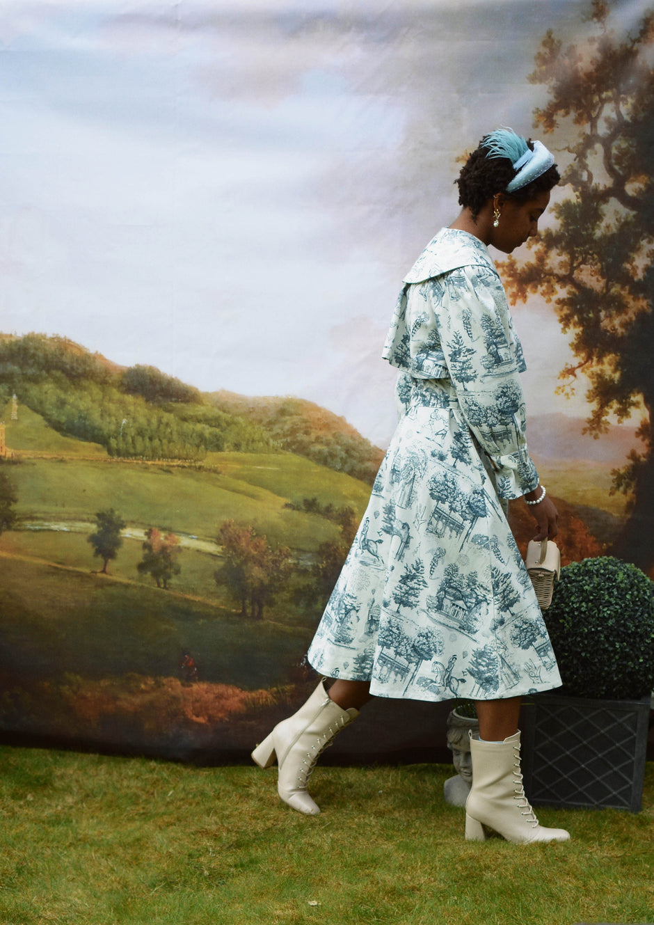 “IT IS A TRUTH UNIVERSALLY ACKNOWLEDGED, THAT A SINGLE MAN IN POSSESSION OF A GOOD FORTUNE, MUST BE IN WANT OF A WIFE” COULD BE THE MOST FAMOUS LINE EVER WRITTEN IN ENGLISH LITERATURE AND IT’S LEGACY HAS INSPIRED THIS COLLECTION. OUR PRINTS REFLECT A ROSE-TINTED FROLIC THROUGH THE ENGLISH COUNTRYSIDE INSPIRED BY REGENCY HIGH SOCIETY’S OUTDOOR PURSUITS OF THE DAY, IMBUED WITH A CELEBRATION OF NATURE IN LINE WITH OUR RENEWED APPRECIATION OF THE NATURAL WORLD. EXPLORE THE SCANDAL AND PLEASURE OF VAUXHALL GARDENS, TAKE A LEISURELY STROLL THROUGH THE MAZE GARDENS, MAYBE EVEN ADMIRE SOME OF THE COUNTY SEATS OF A CERTAIN DASHING ELIGIBLE BACHELOR. SHAPES ARE FORMED FROM OUR OWN INTERPRETATION OF GENTLEMAN’S RIDING COATS, TEA-DRESSES WORN WITH SPENCER JACKETS FOR PICNICS AT BOX HILL AND WHAT WE LIKE TO THINK OF AS A FEMALE DANDY OF THE TIME WITH “SUPERB SELF-CONFIDENCE.”