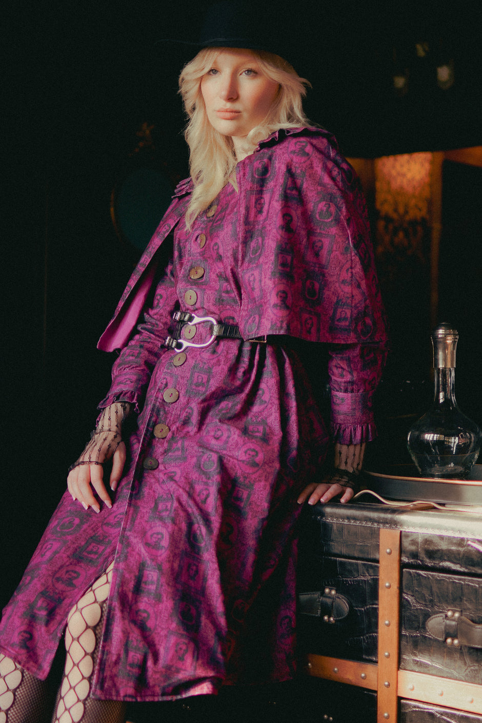 THIS AUTUMN WINTER DELVE INTO THE WORLD OF THE ULTIMATE DANDY, OSCAR WILDE. AS WELL AS HIS LOVE FOR BEAUTY AND DISTASTE FOR WASTE, HE HAD A FLAIR FOR SELF PUBLICITY. HIS STYLE BLENDED REBEL WITH DANDY, THIS GENT CERTAINLY KNEW HOW TO PEACOCK. WILDE PREFERRED THE NATURAL FIBRES AND MUTED TONES SEEN IN THE AESTHETIC MOVEMENT. THIS COLLECTION TAKES INSPIRATION FROM ALL THE ABOVE, MIXING FLAMBOYANT DANDY STYLES, USING NATURAL WOOL AND COTTON FIBRES, WITH PRINTS AND EMBROIDERIES FEATURING SYMBOLISM FROM WILDE’S MOST WELL-KNOWN NOVEL ‘THE PICTURE OF DORIAN GREY.’ THE ULTRA-FASHIONABLE (AND DEADLY) ARSENIC WALLPAPER COLOURS AND DESIGNS FROM THE TIME INSPIRE THE MOODY COLOURS AND REFLECT THE IRONY OF WILDE’S VIEW THAT KEEPING UP WITH FASHION IS A FOLLY. DRESSES AND BLOUSES ARE BLENDED WITH MASCULINE SHAPES INSPIRED BY THE MALE DANDY FASHIONS OF THE LATE 19TH CENTURY, FRILLED CUFFS AND DRESS SHIRT DETAILS ARE ADDED FOR A MORE FLAMBOYANT BUT POLISHED LOOK.