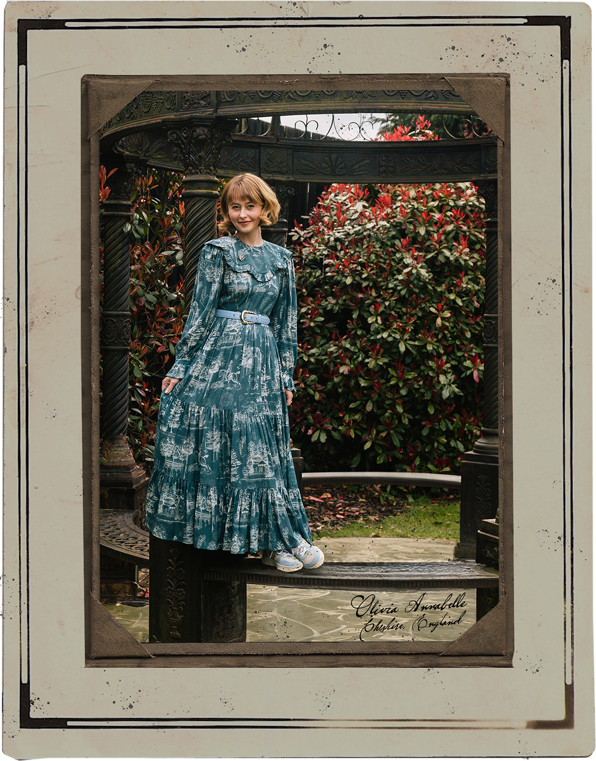 OLIVIA ANNABELLE WAS BORN FROM THE DREAMS AND WANDERINGS OF A DESIGNER NAMED OLIVIA, THAT’S ME, RIGHT HERE IN THE ENCHANTING REALM OF CHESHIRE. LET'S GO BACK TO 2017 WHEN MY GRAND ADVENTURE BEGAN. I HAD A LONGING FOR THE EXTRAORDINARY, A DESIRE FOR UNIQUE GARMENTS ADORNED IN THE MOST FANTASTICAL PRINTED FABRICS. THESE WEREN'T JUST GARMENTS; THEY WERE DREAMS SPUN INTO REALITY. THEY DEFIED TIME AND TRENDS, CHOOSING INSTEAD TO DANCE TO THE RHYTHM OF THEIR OWN WHIMSICAL MELODY.